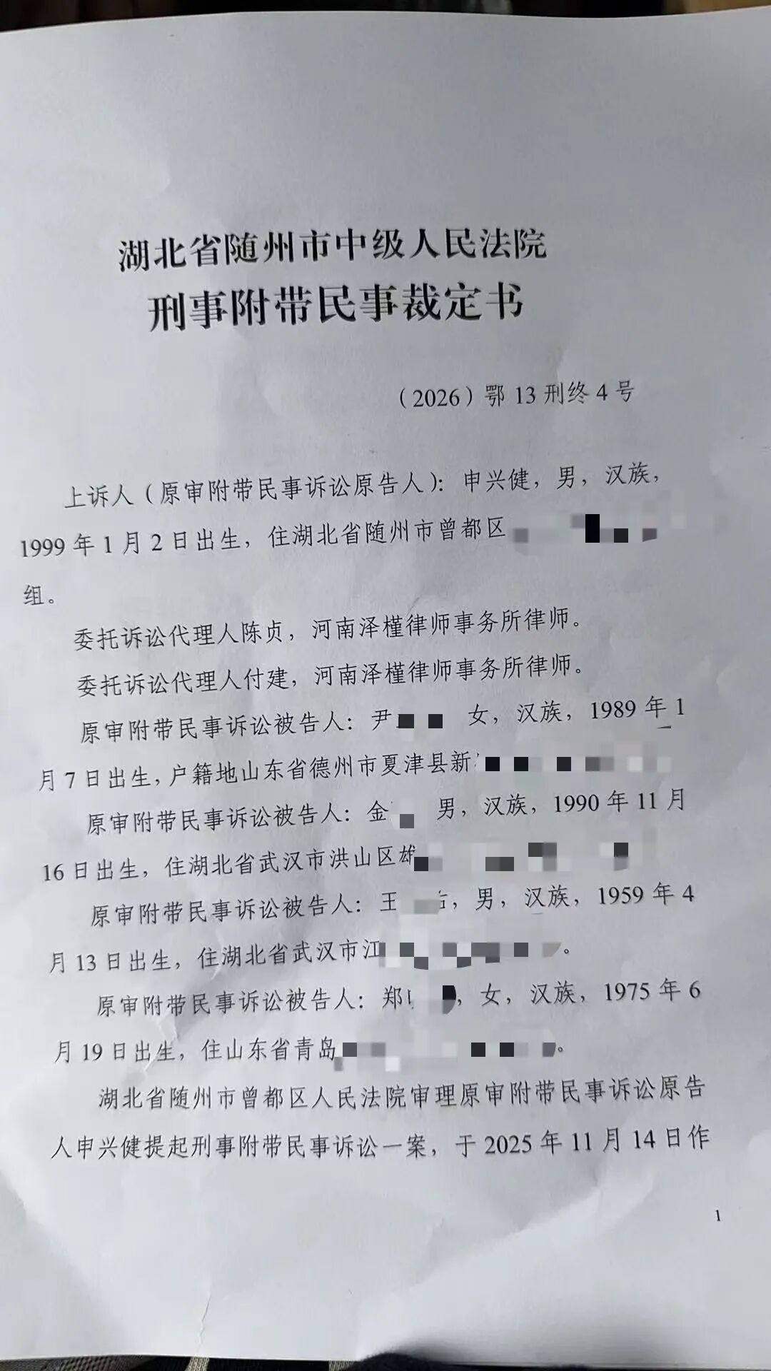 2025年11月14日,湖北随州市曾都区人民法院一审判决,作出刑事附带民事裁定不予受理。申先生不服,提起上诉。2026年2月14日,申先生收到随州市中级人民法院二审裁定,对申先生在尹某肖一案中提起的附带民事诉讼不予受理。