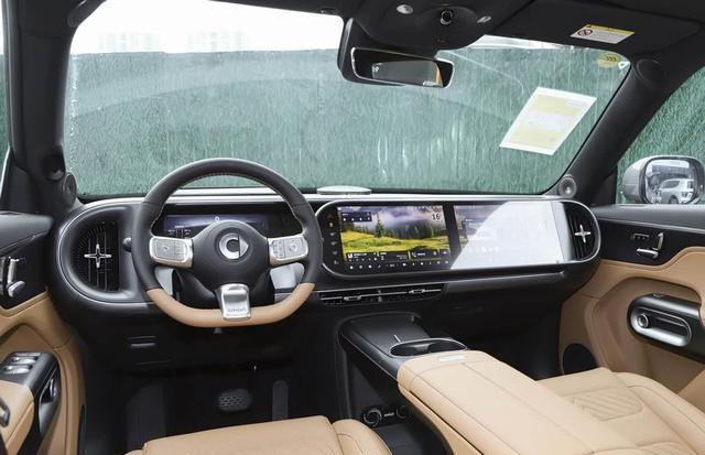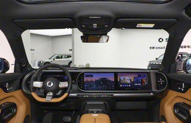 内饰部分,新车配备10.3英寸全液晶仪表盘,搭配双色三辐式多功能方向盘,同时搭载25.6英寸AR增强型抬头显示;中控台中间设置悬浮样式的双13英寸AMOLED超清2.5K联屏,整体设计与纯电版smart精灵#5差异不大。