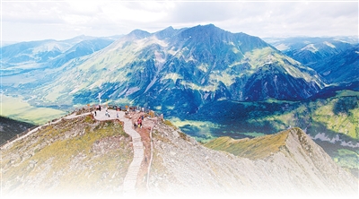 吉克普林云霄峰是阿尔泰山脉的高峰之一,山顶可俯瞰中俄哈蒙四国风光,形成“一脚踏四方”的地理奇观。