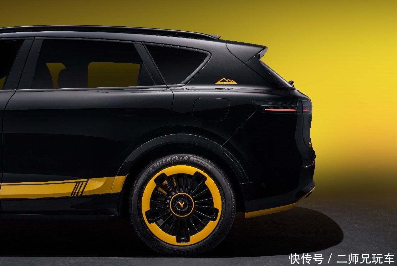新车外观多处细节还采用流光暗影配色装饰件,引擎盖、车门下部加入了亮黄色拉花涂装,前后保区域及翼子板亦有亮黄装饰点缀,进一步强化运动基因;此外,专属“峰回路转” 尾翼装饰以及定制FREE+玄金尾标,则彰显了车辆的特别身份;新车还配备20英寸流光驭风动感轮毂,黑色轮辐与明亮热情的流金色轮辋交相辉映,搭配黄色卡钳,不仅拉满运动生命力,更在转动时呈现“流光”环绕的动态效果,每一处细节都经得起凝视。